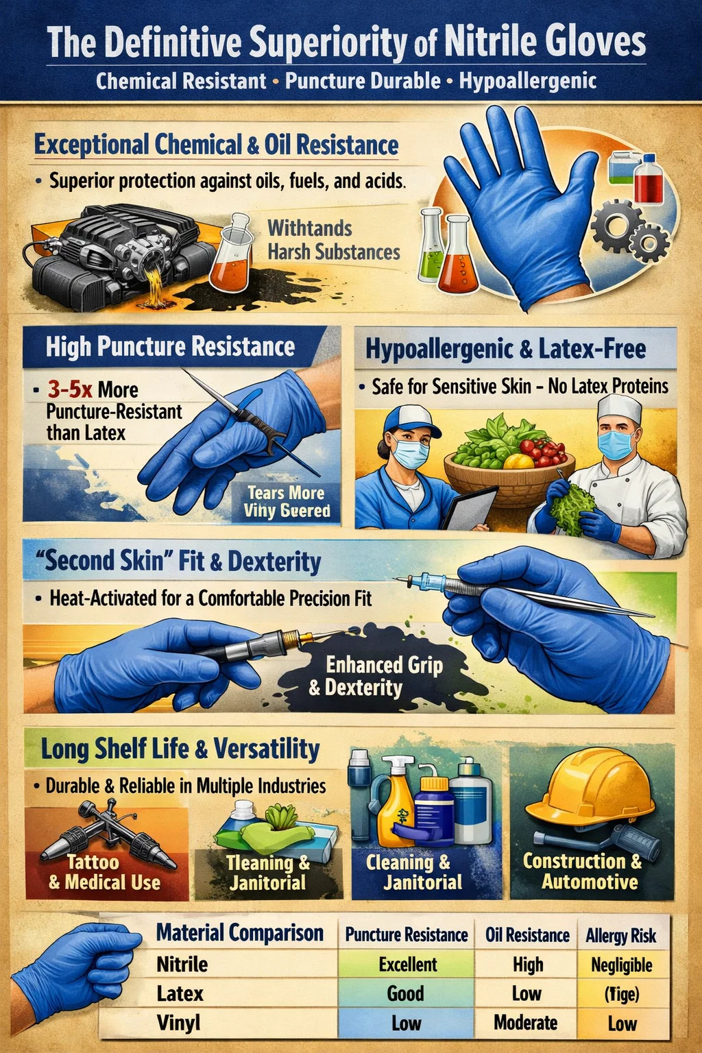 În industria tatuajelor , se preferă nitrilul negru deoarece ascunde petele de cerneală și rezistă la vaselina folosită în timpul procesului. În munca de menaj , protejează împotriva înălbitorului și a agenților de curățare pe bază de amoniac care ar pătrunde cu ușurință prin mănuși de vinil mai ieftine. Această versatilitate demonstrează că nitrilul nu este doar o altă opțiune de unică folosință, ci este un instrument specializat pentru siguranță.