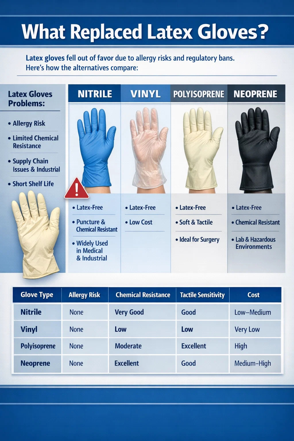 Acestea fiind spuse, nitrilul nu este singurul înlocuitor. Mănușile din vinil, neopren, poliizopren și polimer hibrid ocupă fiecare nișe specifice, în funcție de sarcină, sensibilitatea necesară, nevoile de rezistență chimică și buget. Acest articol le prezintă pe toate în detaliu - explicând de ce a avut loc trecerea de la latex, ce oferă alternativele și cum să o alegeți pe cea potrivită pentru cazul dvs. de utilizare specific.