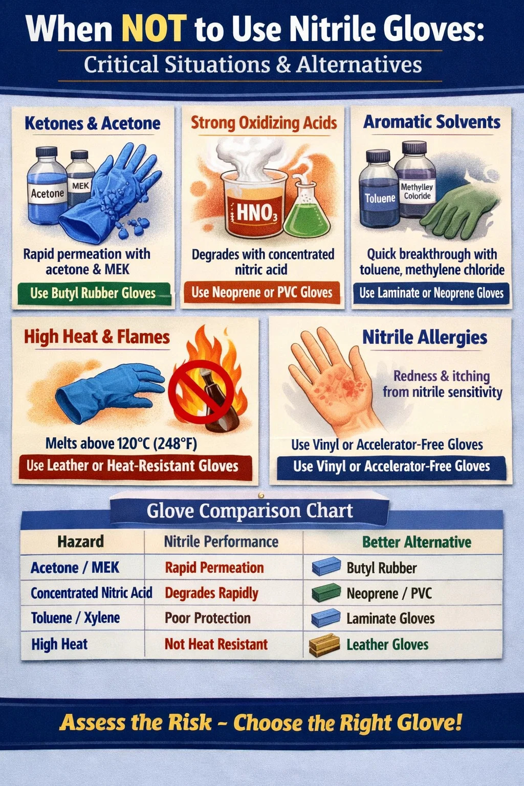 Răspunsul scurt: evitați mănușile de nitril atunci când manipulați anumite cetone, acizi oxidanți puternici sau solvenți foarte concentrați; atunci când lucrați cu căldură extremă sau cu flăcări deschise; când dexteritatea tactilă fină este critică și durata sarcinii este scurtă; sau când persoana care le poartă are o sensibilitate documentată la nitril. Citiți mai departe pentru defalcarea completă.