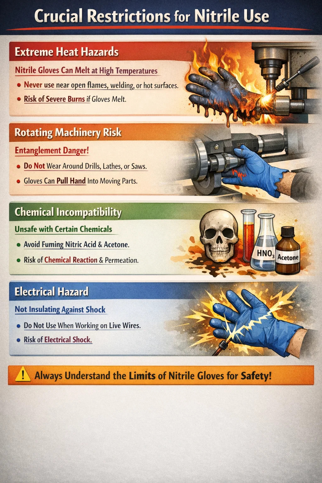 în timp ce mănuși de nitril sunt standardul de aur pentru multe industrii, ar trebui nu le purtați când lucrați cu flăcări deschise, când manipulați acizi puternic oxidanți sau când utilizați mașini rotative. . Aceste mănuși sunt în esență o formă de plastic (cauciuc sintetic); se vor topi și se vor topi cu pielea ta în scenarii cu căldură ridicată și nu au puterea de „despărțire” necesară pentru a preveni mâna ta să fie trasă într-un motor care se învârte sau într-un strung. Înțelegerea acestor limite este vitală pentru siguranța la locul de muncă.